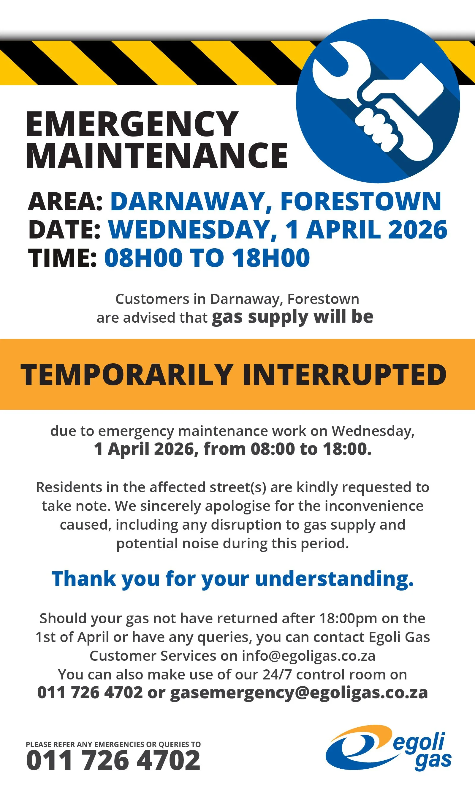 TEMPORARILY INTERRUPTED Tuesday, 31 March 2026 15:00 Wednesday, 01 April 2026 18:00 Egoli Gas 1 Annet Road Johannesburg, GP, 2092 South Africa (map) Google Calendar ICS